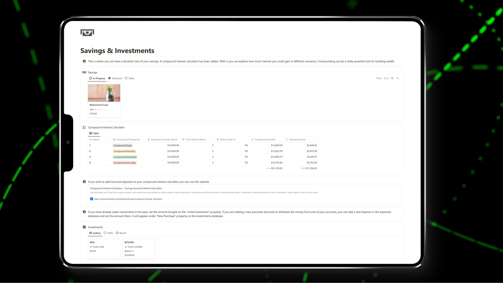 • Savings: Over time, consistent saving can lead to significant financial growth and provide a solid foundation for a secure and prosperous future. Our template includes a compound interest calculator to help you plan and make the best out of your savings.