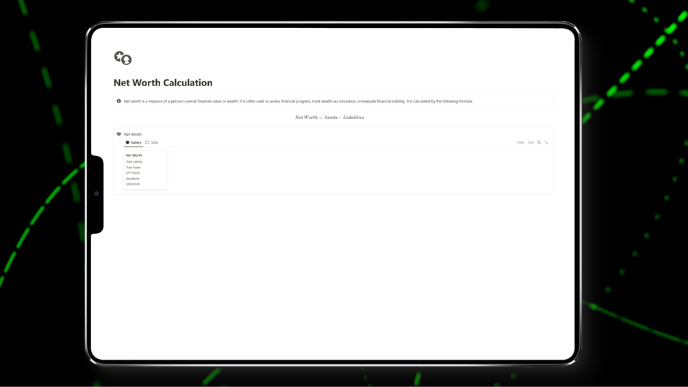• Net Worth Calculation: Provides an instant snapshot of financial health and overall wealth. Net worth provides a benchmark for monitoring financial growth and stability, is an essential component in long-term financial planning, and plays an important role in determining borrowing capacity and creditworthiness.